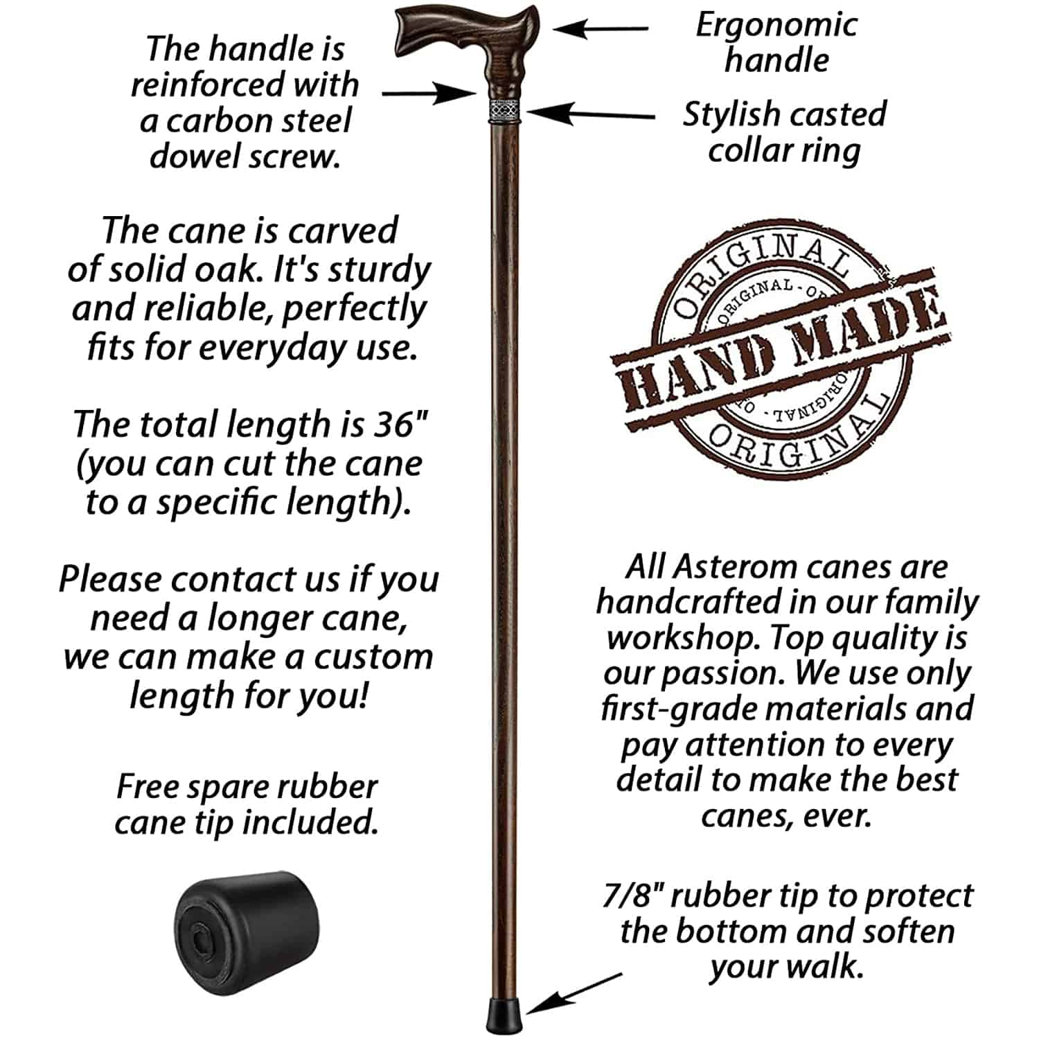 - Only premium materials. All Asterom canes are carved of first-grade hardwood oak; they are very sturdy and have beautiful wood grain. The finish is made using only hypoallergenic, high-quality Italian coatings.