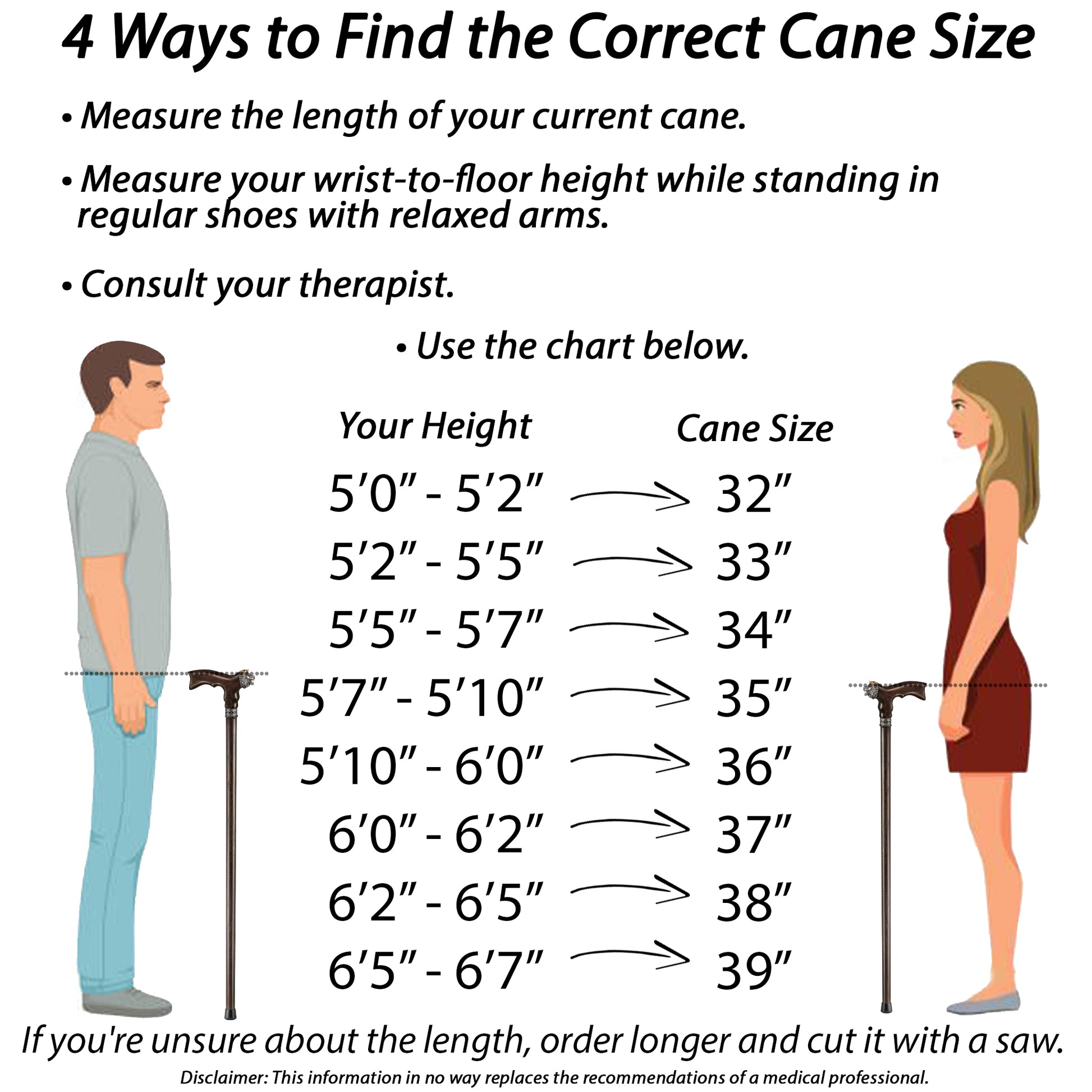 Put on the shoes you normally wear and ask someone to measure the distance from the floor to your wrist while your arms hang relaxed at your sides. The number of inches between your wrist and the floor is the correct cane length. This is the most accurate method.